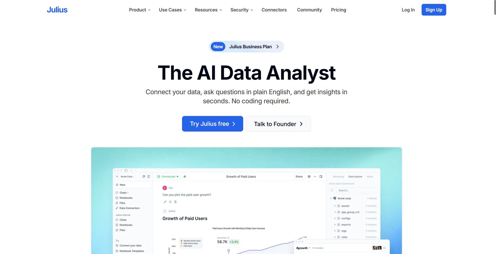 We built Julius as an AI-native data analysis platform that supports augmented analytics for teams that need quick answers without SQL. You upload files or connect to databases like PostgreSQL, Snowflake, and BigQuery, then ask questions in natural language. Julius generates the underlying queries, builds visualizations, and suggests relevant follow-up questions as you work.