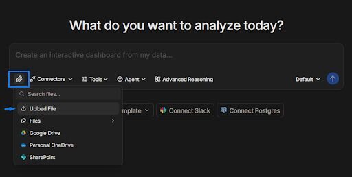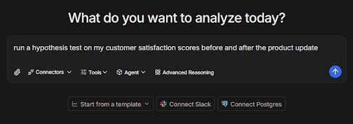 Direct connections: Link databases like PostgreSQL, Snowflake, and BigQuery, or integrate with Google Ads and other business tools. You can also upload CSV or Excel files. Your analysis can reflect live data, so you’re less likely to rely on outdated spreadsheets.